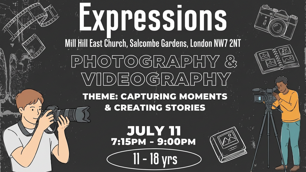 A creative youth evening at Mill Hill East Church on Saturday 11 July 2026, exploring faith and life through the lens.